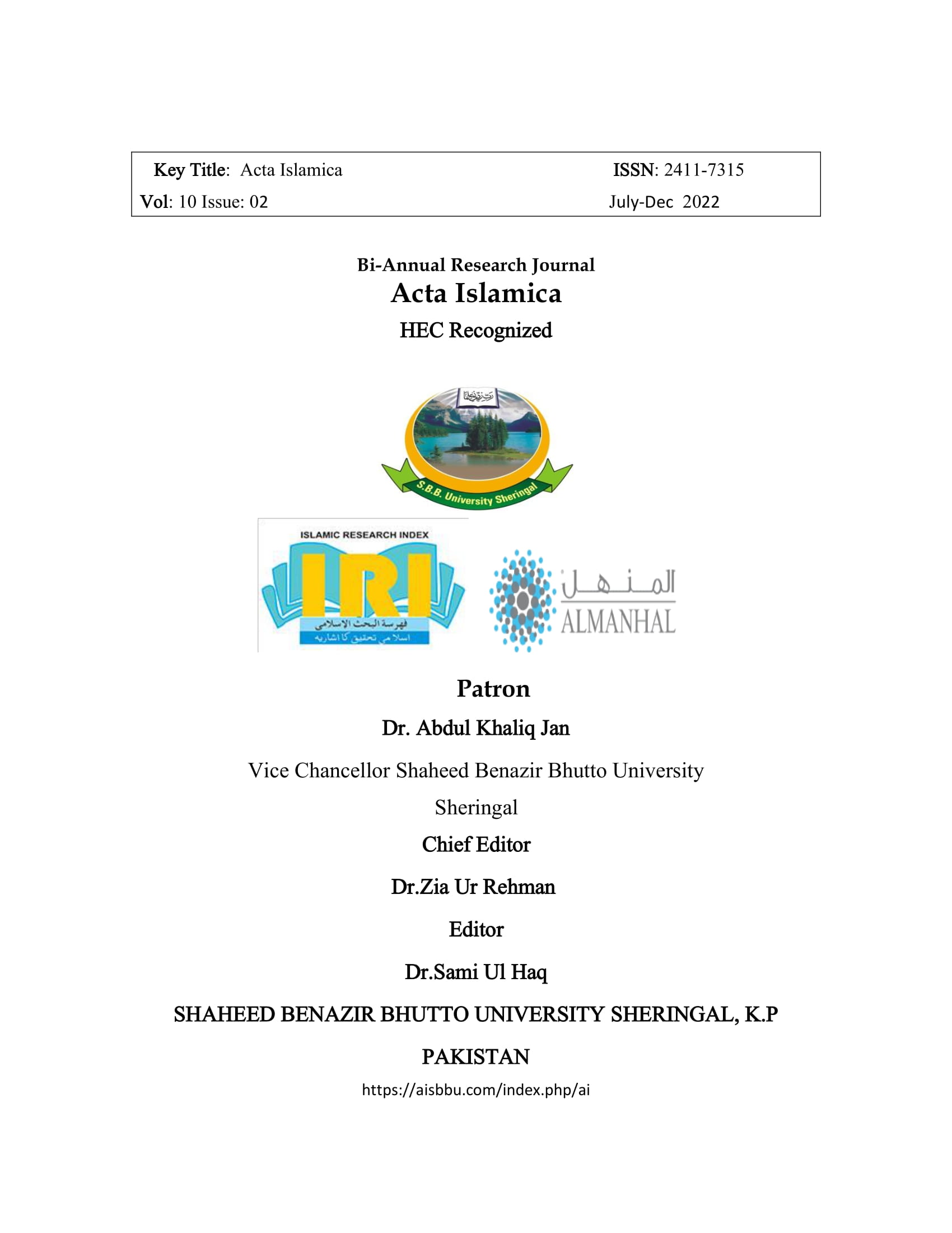 Vol. 10 No. 02 (2022): ACTA ISLAMICA JULY-DEC 2022